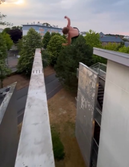 BELOW: This is Oleg Cricket all the way! Somehow STORROR only ranked this rooftop leap by Callum as the 4th best of all time? Overshoot this thing and you're friggin' dead! What does he have to do to be number one? Cross the crocodile-infested Mara River in Tanzania?