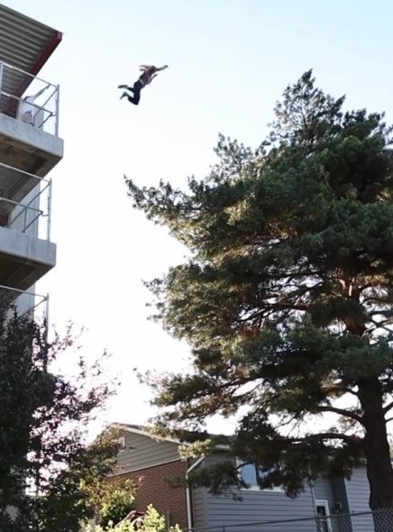 5/15/2025 - This was a brutal landing for the ankles, as well as a face plant. But, notice the distance down to the concrete below. Good thing unpetitpaul held on! This looked like an unpleasant mix of broken ankles, plantar fasciitis, broken ribs, and face-plant.