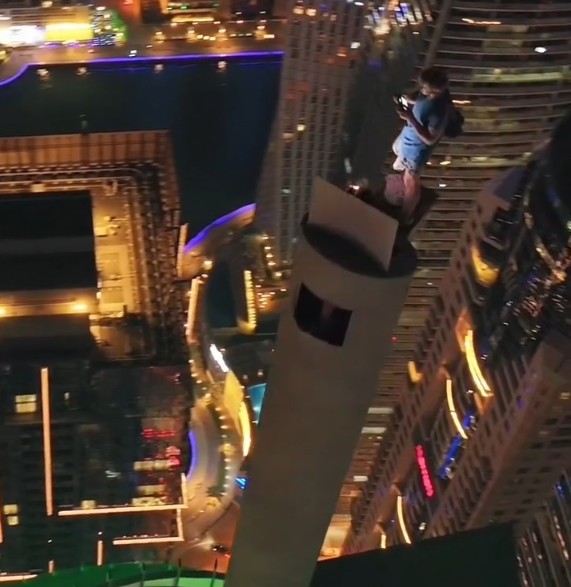 7/9/2025 - RodionLorax is way too casual standing out on this platform at nose-bleed heights in Dubai! He just stares at the video screen of his drone. No biggie.